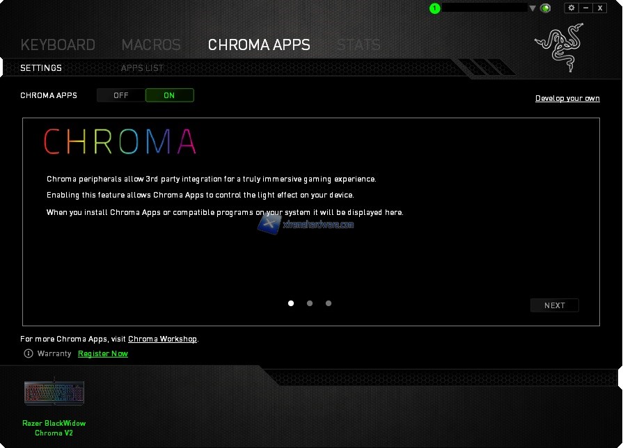 Menù ‘’Chroma Apps’’. Razer da quando ha creato il sito Chroma Workshop ha messo a disposizione una vasta raccolta di applicativi compatibili con il sistema Chroma nonché diversi effetti da scaricare e importare successivamente per i più famosi giochi tra cui il più recente Overwatch.